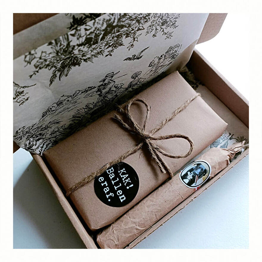 Dit pakket met 'kak ballen er af' sticker en een knabbelsigaar: